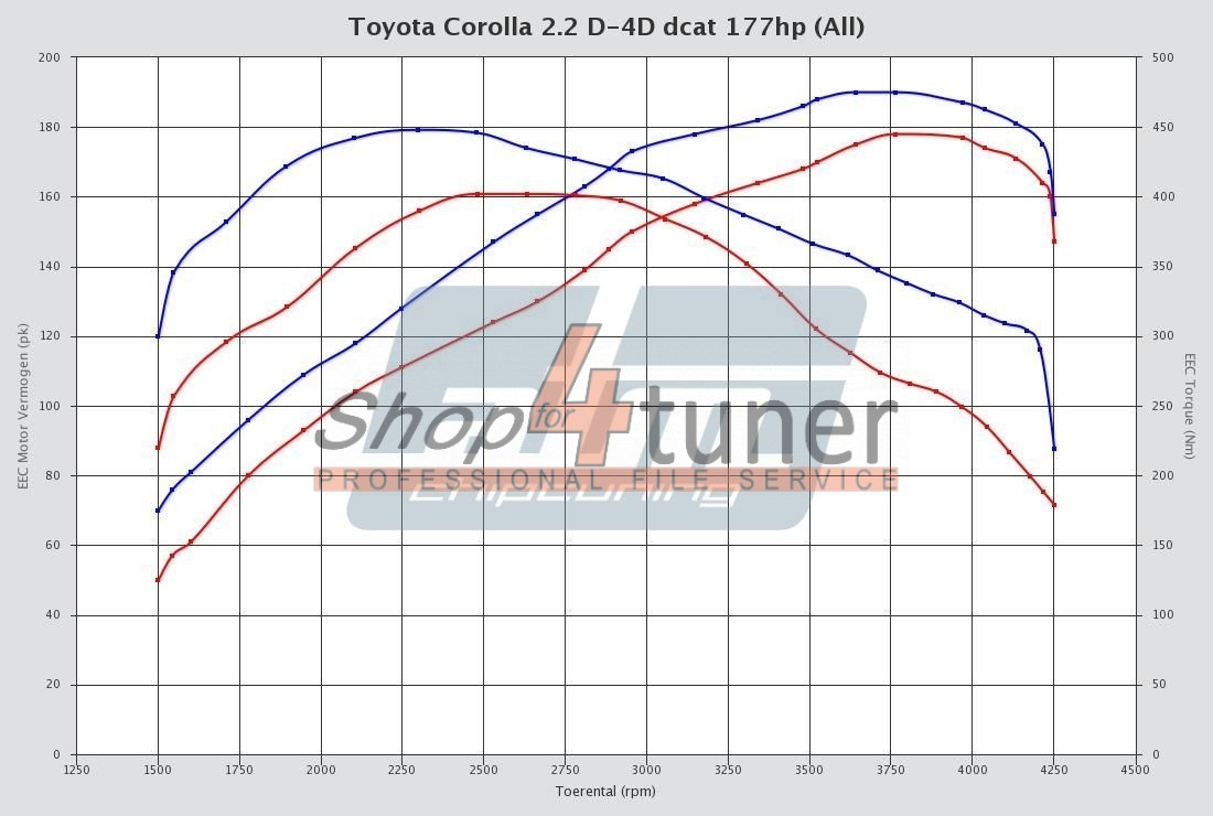 Powerconcept srl - Shop4tuner.com is leading in the development of Toyota Corolla 2.2 D-4D dcat 177hp tuning files. The development of each Toyota Corolla 2.2 D-4D dcat 177hp tuning file is the result of perfection and dedication by Powerconcept srl - Shop4tuner.com programmers. The organization only uses the latest technologies and has many years experience in ECU remapping software. Many (chiptuning) organizations around the globe download their tuning files for Toyota Corolla 2.2 D-4D dcat 177hp at Powerconcept srl - Shop4tuner.com for the best possible result. All Toyota Corolla 2.2 D-4D dcat 177hp tuning files deliver the best possible performance and results within the safety margins.